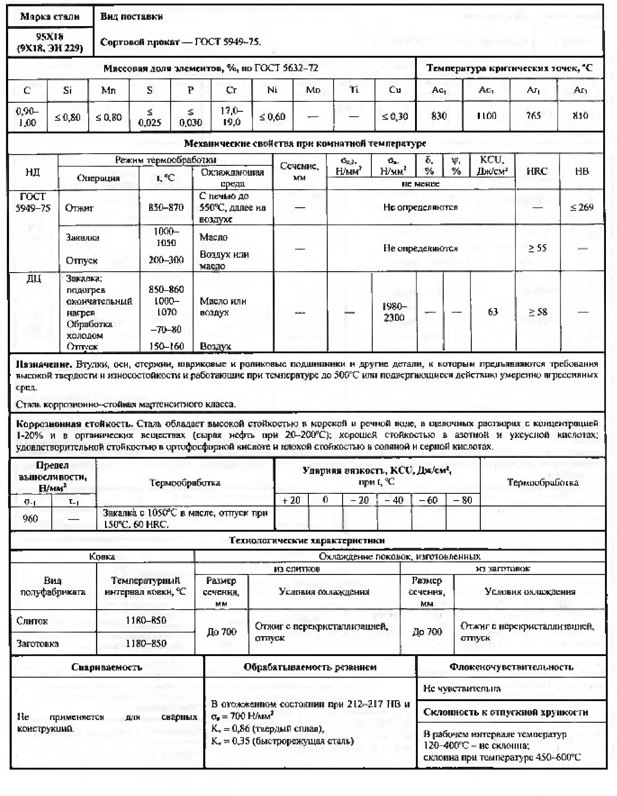 Сталь 95Х18 (ЭИ229, 9X18) применяется в приборостроении для изготовления деталей, к которым предъявляются требования повышенной твердости и износостойкости, работающих при температурах до +500 С и подвергающихся воздействию сред умеренной агрессивности.